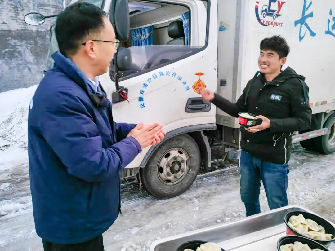 “這么冷的天,公司領導還親自來送慰問餐,我們這些拉貨司機不但來拉餃子,還免費吃餃子,真是感激不盡呀”一位司機師傅接過送上的慰問餐時,高興地說到。